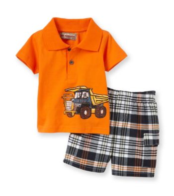 Apparel Sets. Make playtime a little more stylish with this polo and shorts set. Cool and handsome, your little guy can now show off his stylish side with Kids Headquarters Baby Boys' Orange 2-pc. Truck Polo Shorts Set. This set features a polo style short sleeve top with a large truck on the front, as well as a pair of matching plaid shorts with an elasticized waist and side pockets. Orange Includes: (1) top and (1) shorts Shorts: Elasticized waist 100% Cotton ImportedUSD 16.49
