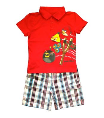 Apparel Sets. A cute new look you re both going to love. He loves the cartoon and you ll adore the style of this 2-piece polo and shorts set from Angry Birds. This comfy set features a short sleeve polo T-shirt with Angry Birds screen print and plaid cargo shorts to match. You ll both be happy when he puts this set on. Red 2-pc. Shorts set Short sleeve polo Angry Birds slingshot screenprint Plaid cargo shorts 100% Cotton Machine washable ImportedUSD 15.0