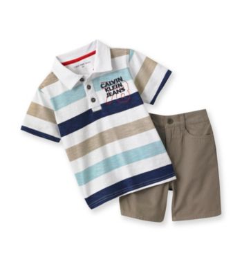 Apparel Sets. All style, this polo and shorts set is causal style at its finest and tiniest. Paired together, or mixed and matched with anything else in his closet, the Calvin Klein Baby Boys' Blue/Khaki Striped Polo and Shorts Set is as stylish as it gets. This cool set features a short sleeve polo style top with a fold-over collar, a striped pattern, and stitched branding, as well as a matching pair of khaki shorts with two side pockets. Khaki Set includes top and shorts 100% cotton ImportedUSD 23.24
