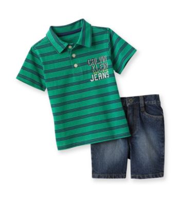 Apparel Sets. All style, this polo and shorts set is causal style at its finest and tiniest. Paired together, or mixed and matched with anything else in his closet, the Calvin Klein Baby Boys' Green/Navy Striped Polo and Shorts Set is as stylish as it gets. This cool set features a short sleeve polo style top with a fold-over collar, a striped pattern, and screenprinted branding, as well as a matching pair of denim shorts with two side pockets. Green Set includes: top and shorts 100% cotton ImportedUSD 15.49