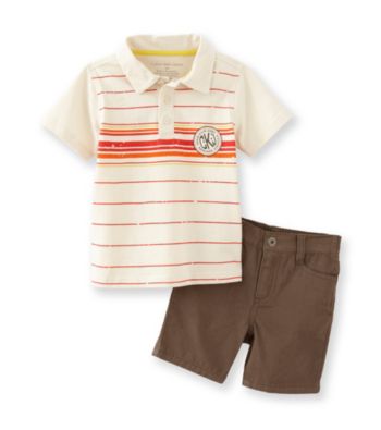 Apparel Sets. Casual and comfortable, this 2-pc. set from Calvin Klein Jeans features a striped polo and matching shorts, perfect for warm and sunny days. Featured in cream/brown 2-pc. set includes polo shirt and shorts Short sleeve polo features striped logo screen print Brown twill shorts feature zip fly and belt loops Machine washable Cotton ImportedUSD 18.49
