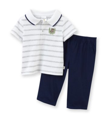 Apparel Sets. Dress him for success. Start him off on the right foot with a 2-piece short sleeve polo set from Cuddle Bear. He can t help but look like a little man in this white and heather grey yarn dyed striped polo with collegiate style embroidery. Looking great doesn t mean he has to sacrifice comfort; these pants feature an elastic waistband for a relaxed fit. With style like this, there s no limit to what he can achieve. White/Grey Polo collar Elastic waist 100% cotton jersey top 100% cotton woven pant ImportedUSD 14.4