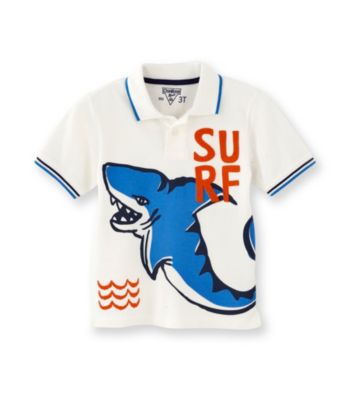 Tops. Check out the tasty waves in this shirt! The OshKosh B'Gosh Boys' 2T-4T White Short Sleeve Shark Pique Polo is perfect for your little surfer dude. This ivory short sleeve pique polo features a shark and waves screen print along with a SURF" applique. Made of 100% cotton, this machine washable shirt will look at great as it feels. White Machine washable 100% cotton ImportedUSD 7.49